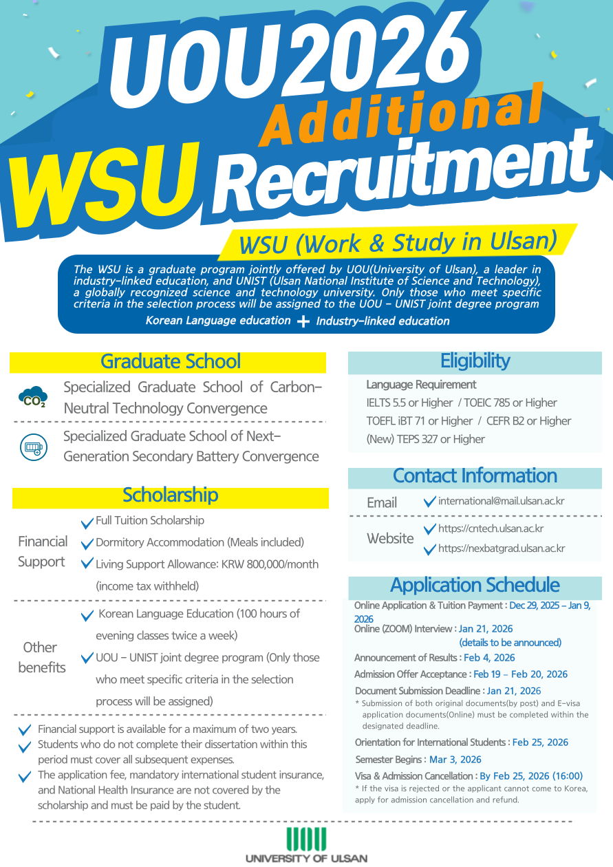 The Specialize Graduate School of Next-Generation Secondary Battery Convergence at the University of Ulsan is now accepting applications for the Spring 2026 intake under the WSU(Work&Study in Ulsan) Program.